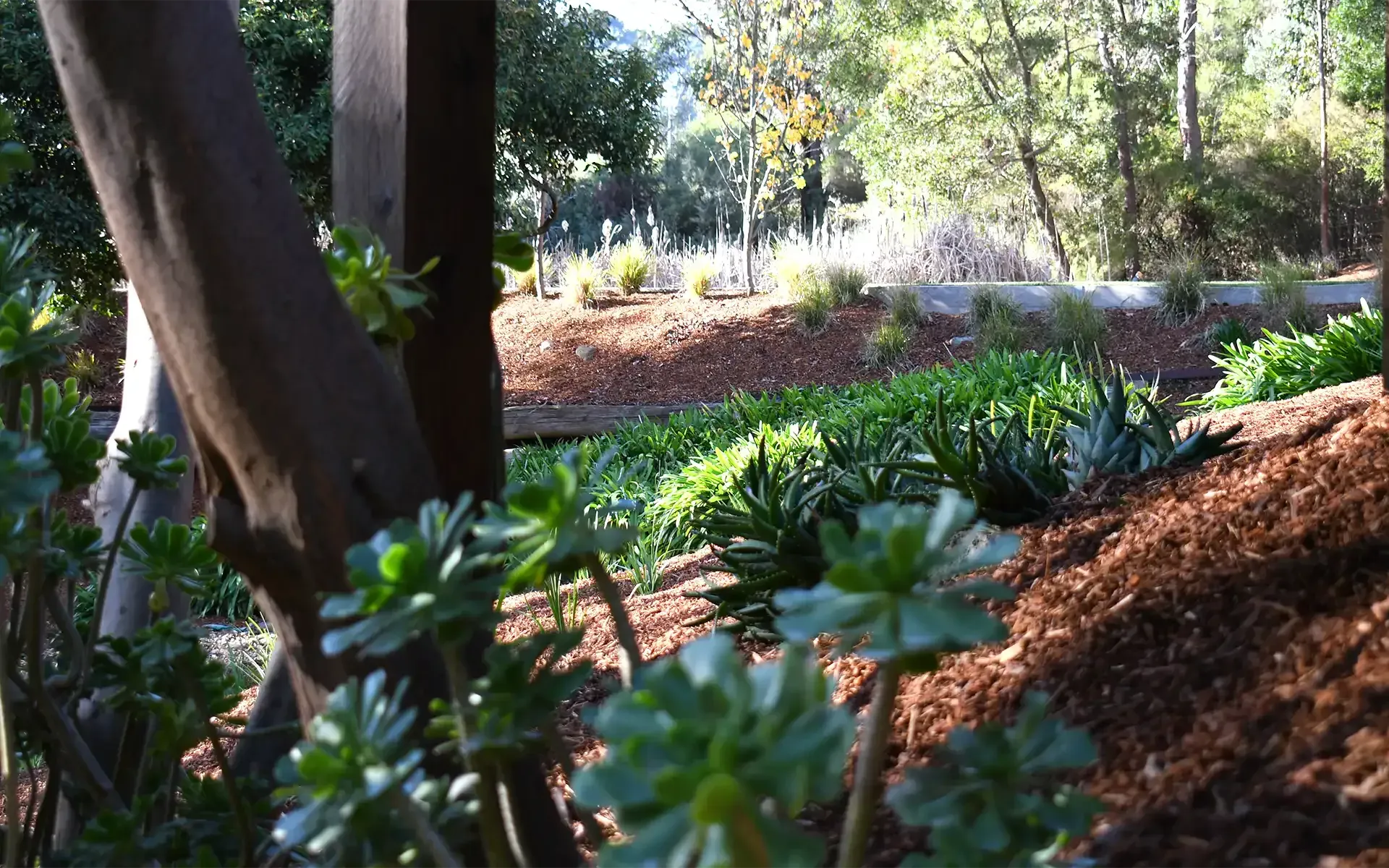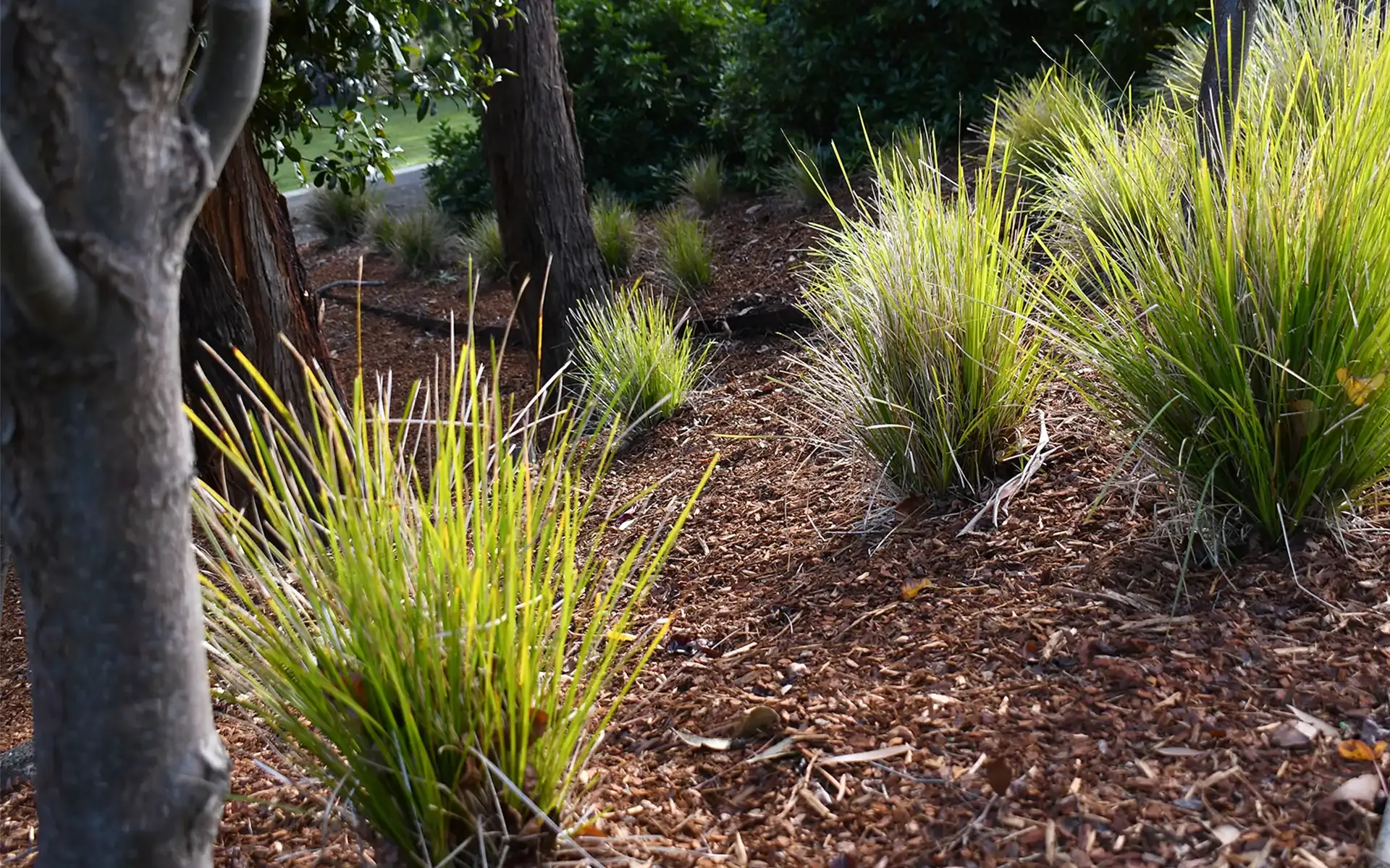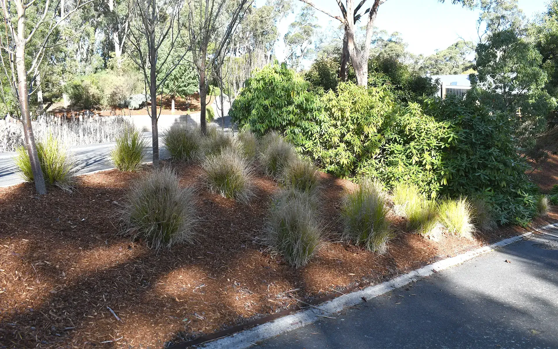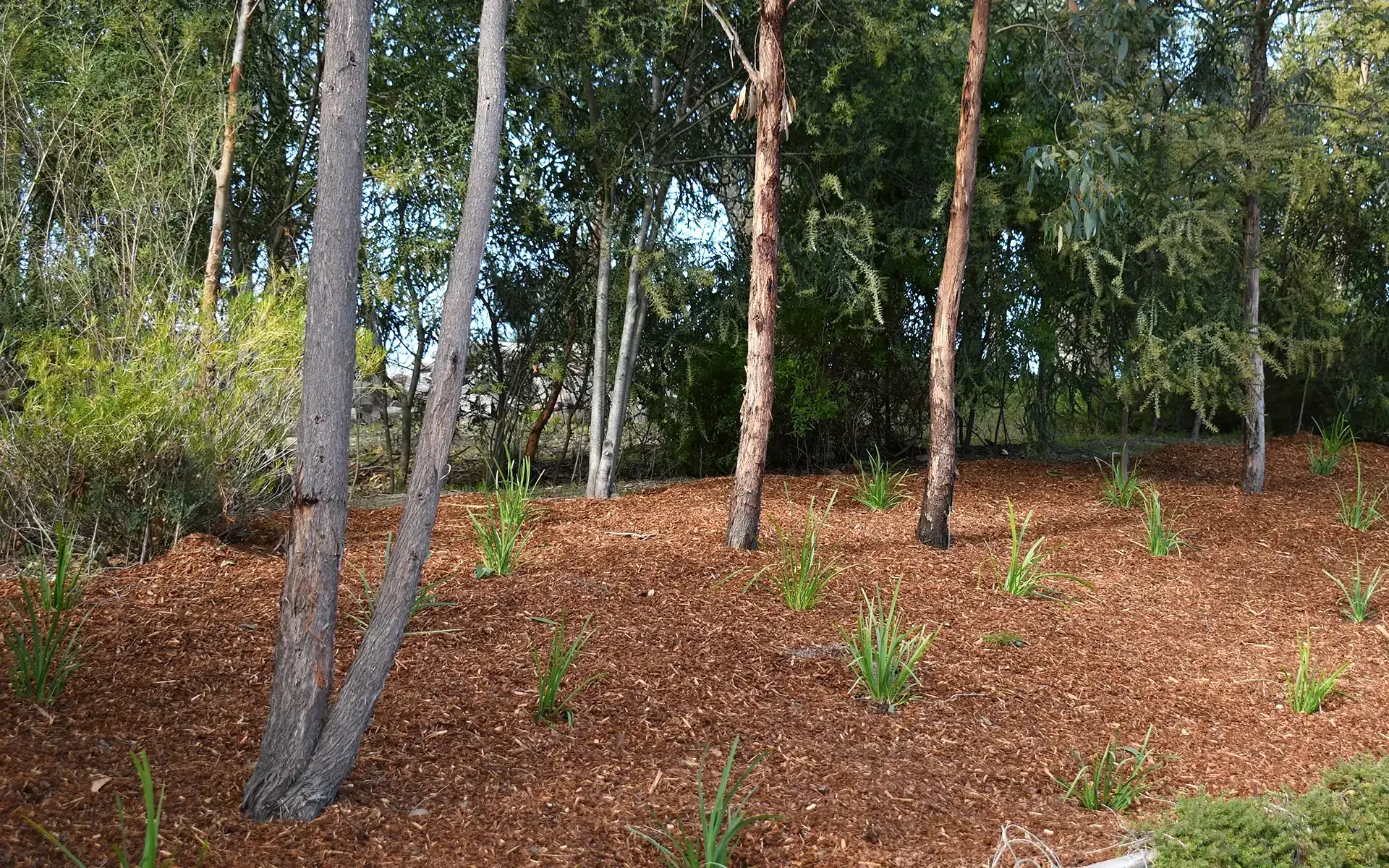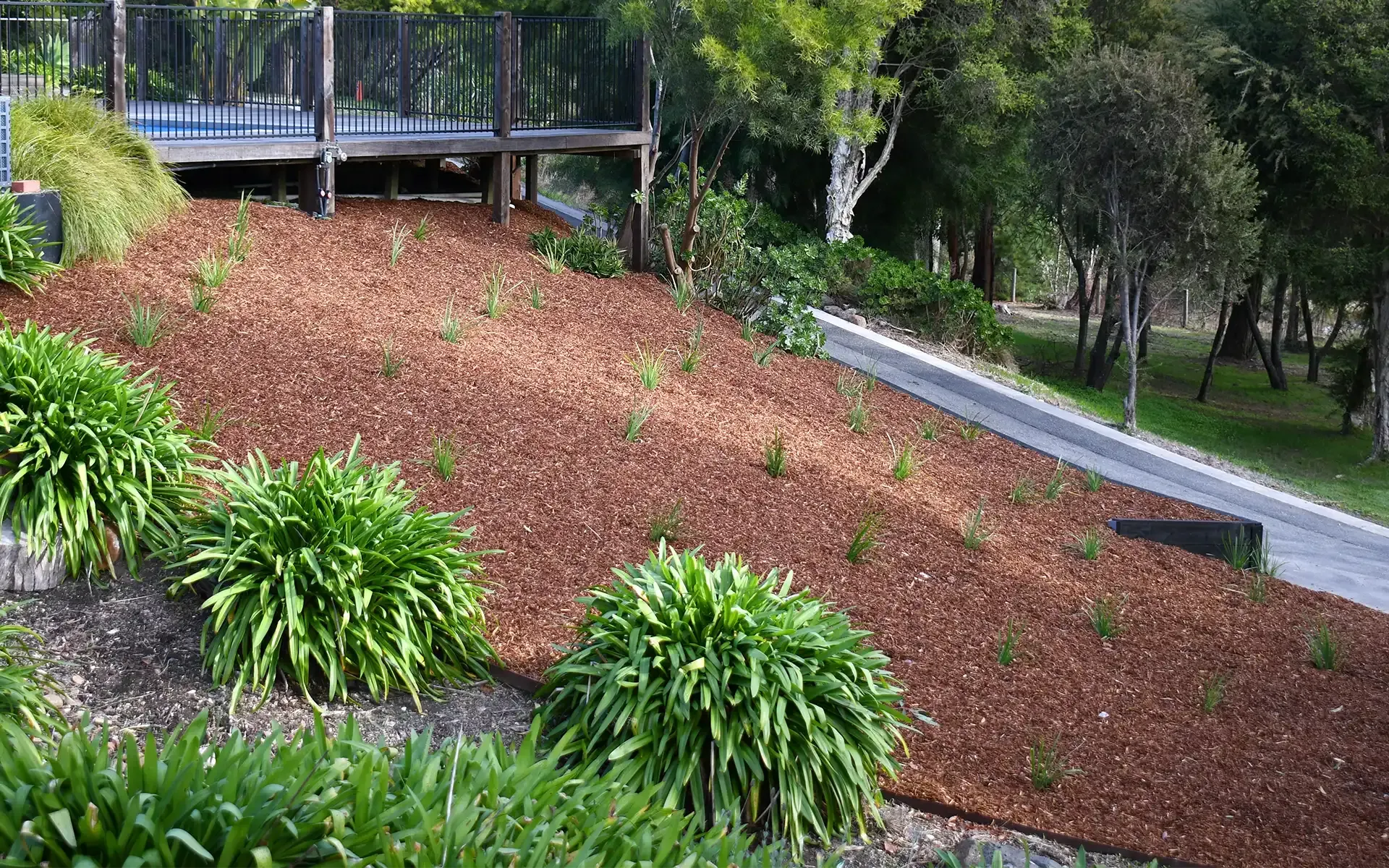 A private oasis created from beautiful native plants and red bark mulch beds.