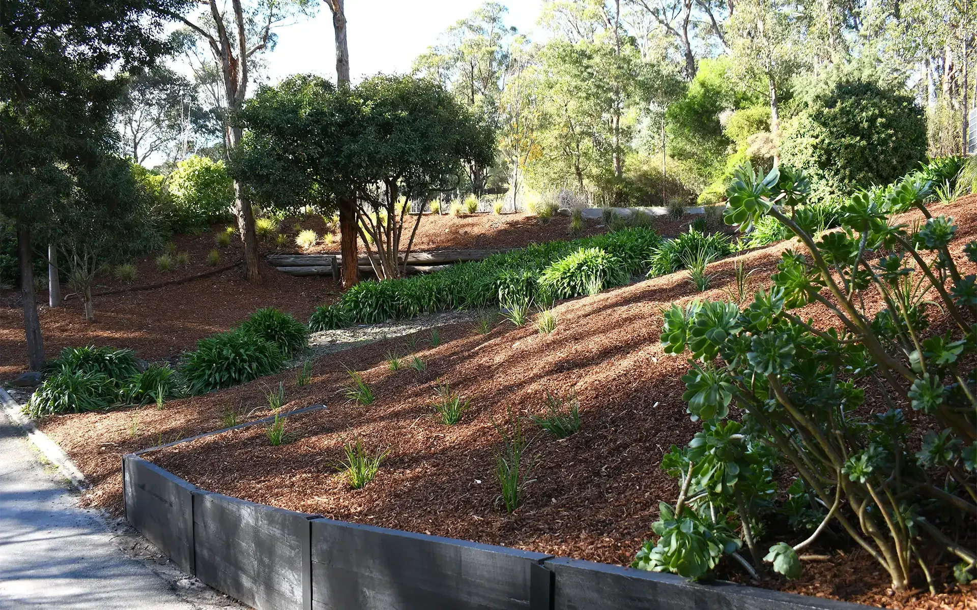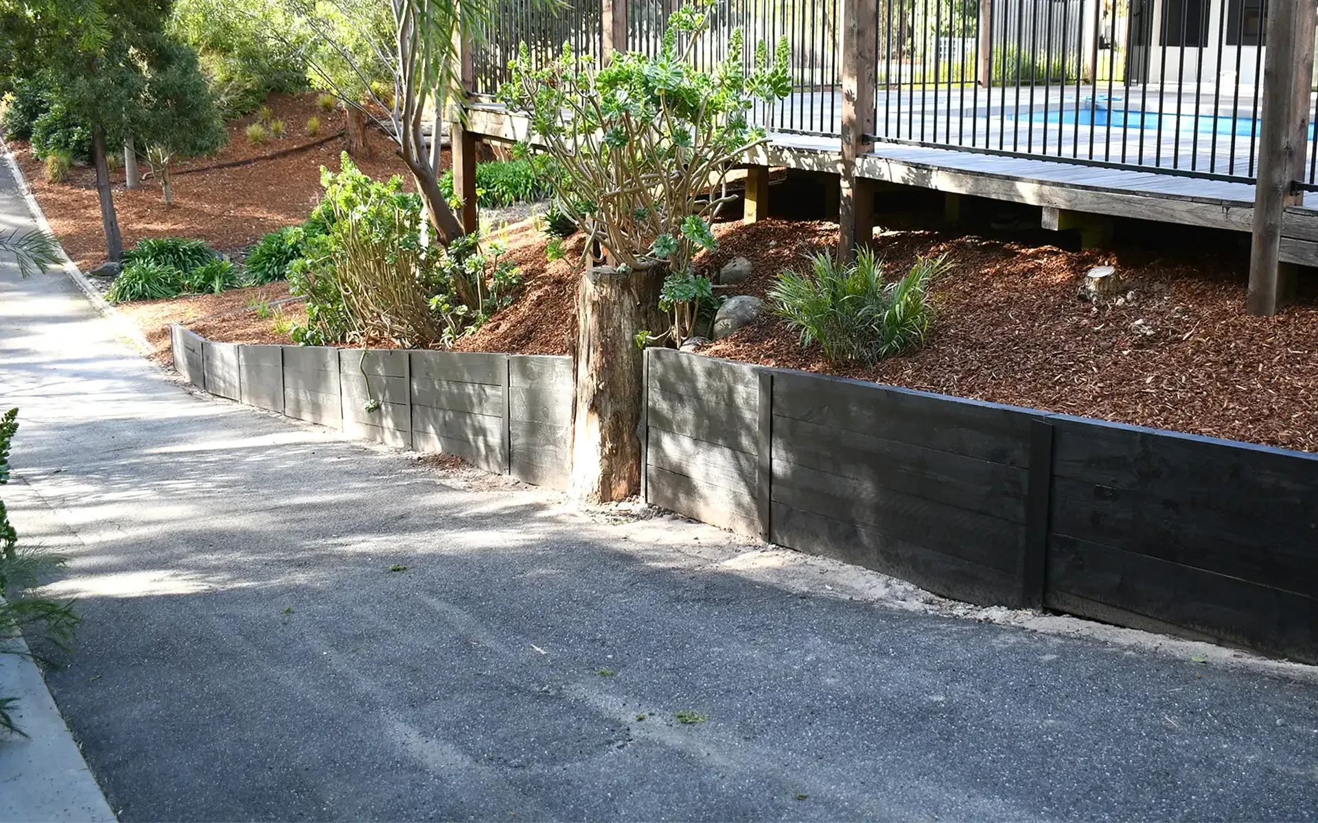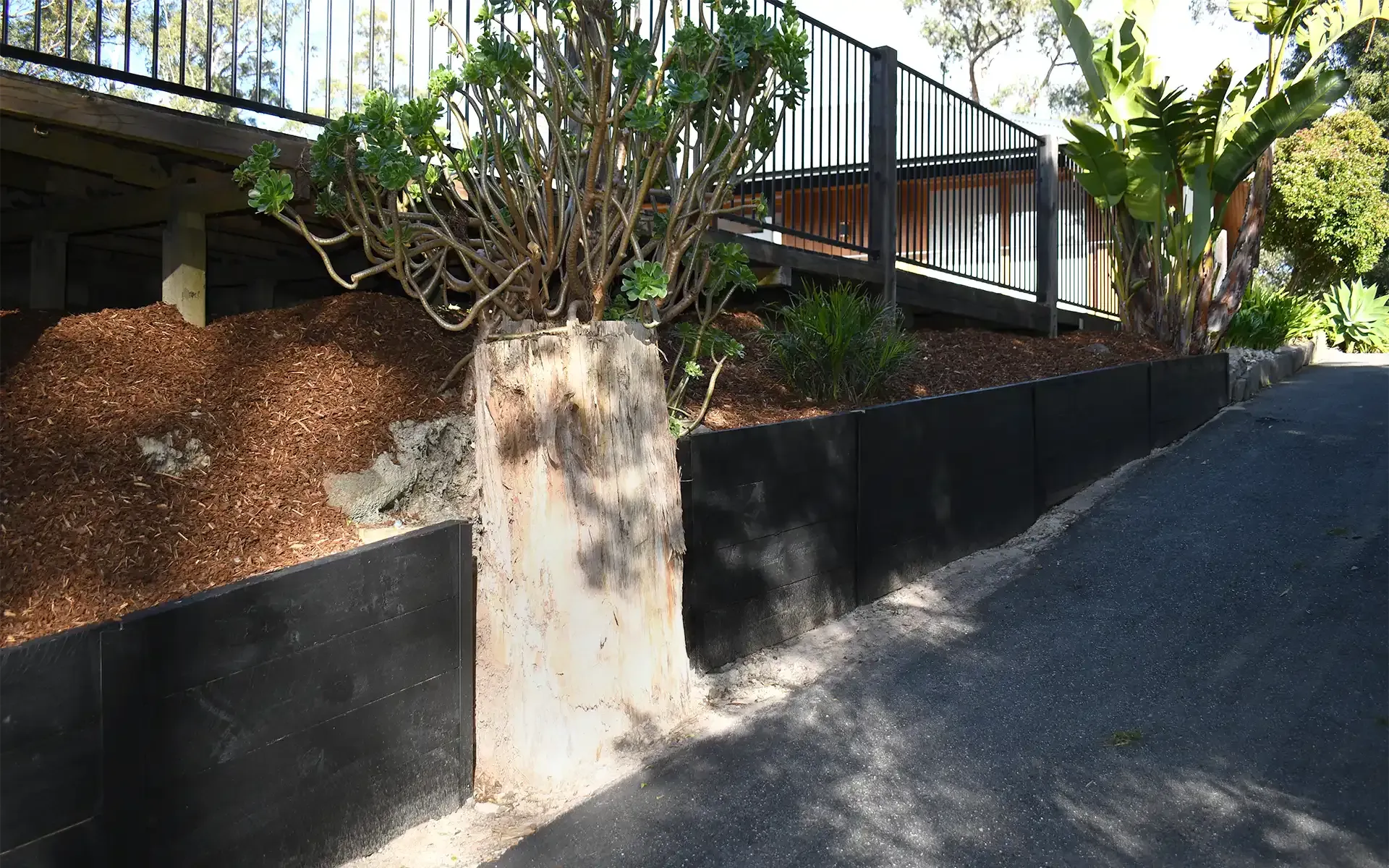 A black wooden retaining wall merges seamlessly with the surrounding flora, providing a perfect accent to the garden as well as structural integrity for the driveway.