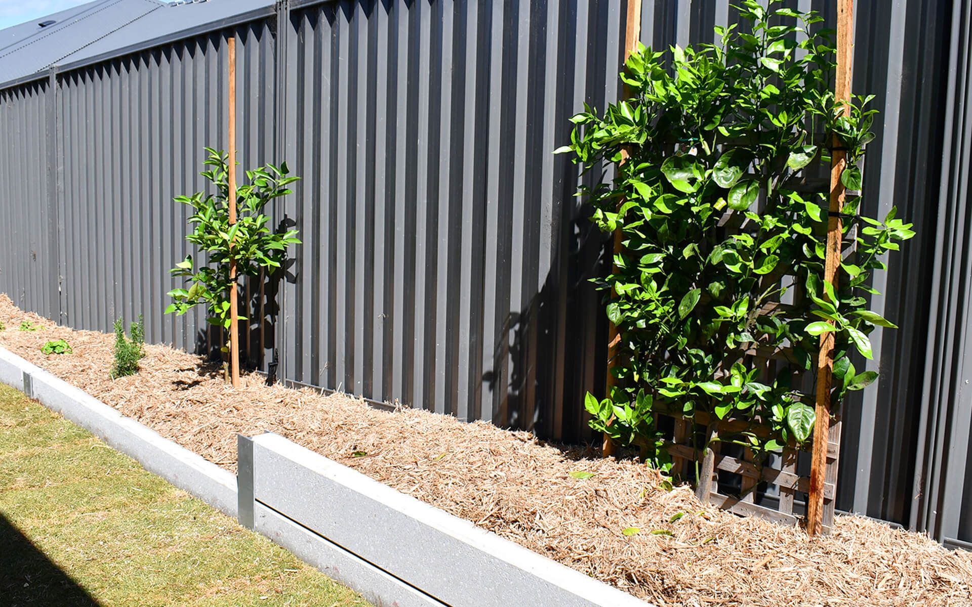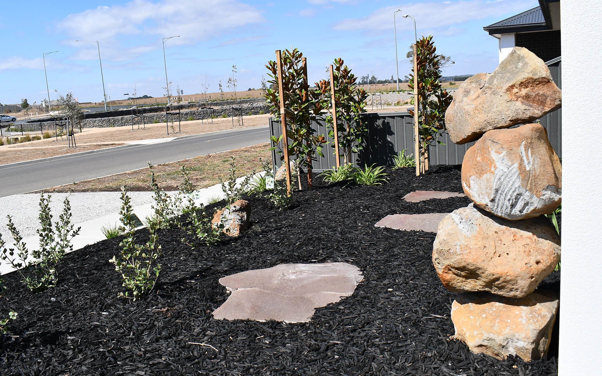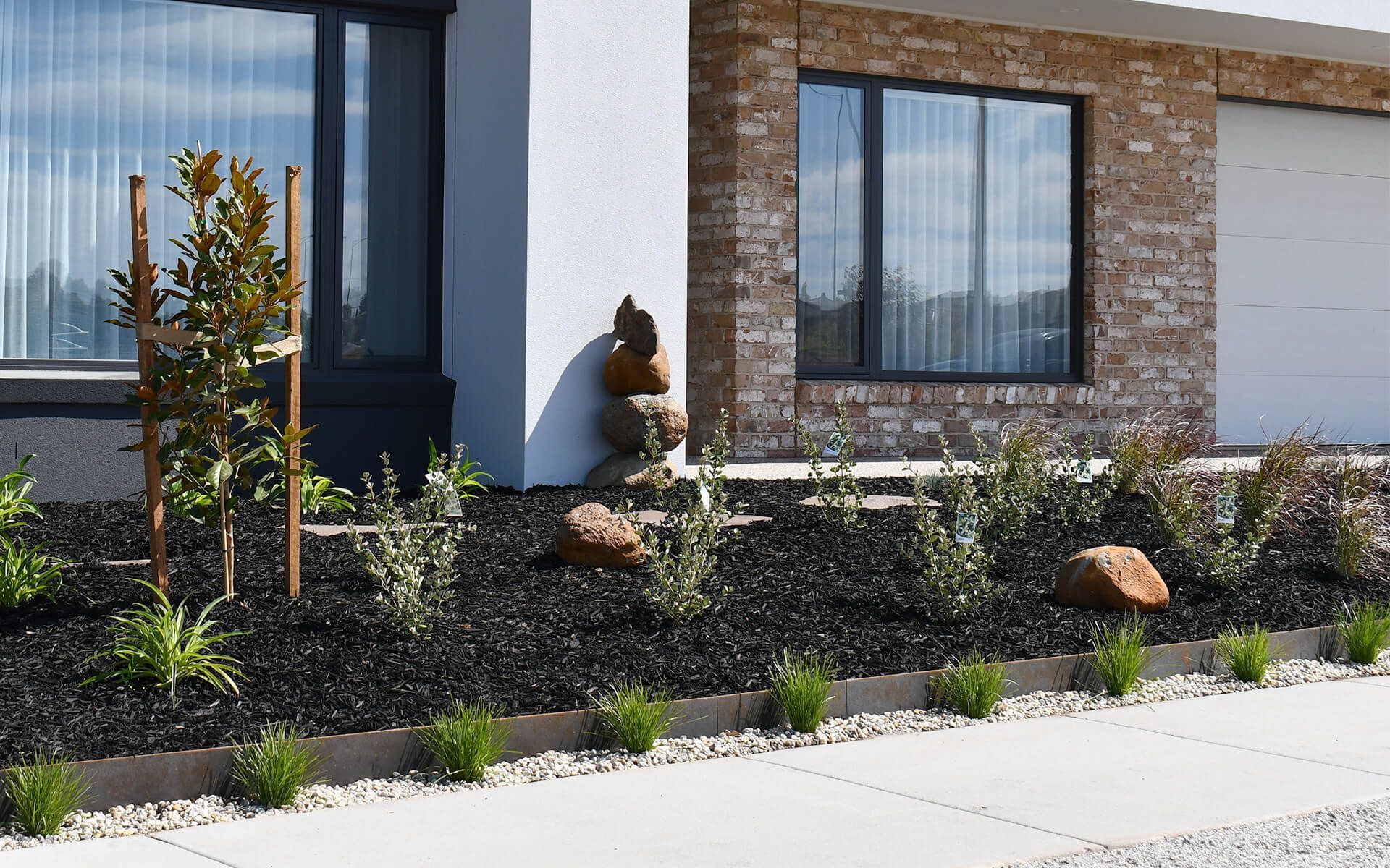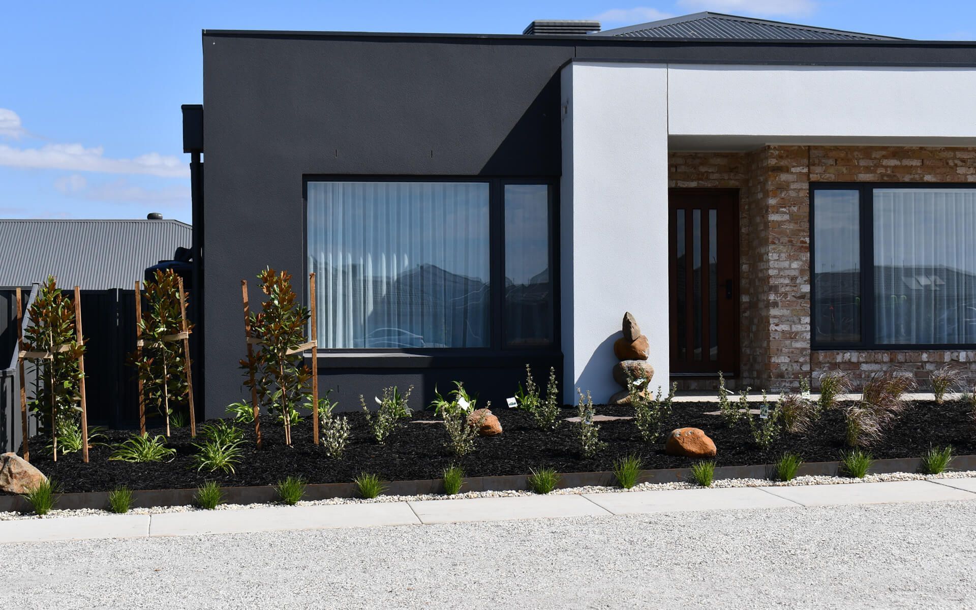 This phenomenal new home landscaping project features a white gravel nature strip, freeing up your weekends while also looking great. The front garden perfectly accents the house facade, with striking black bark and inlayed natural steppers.