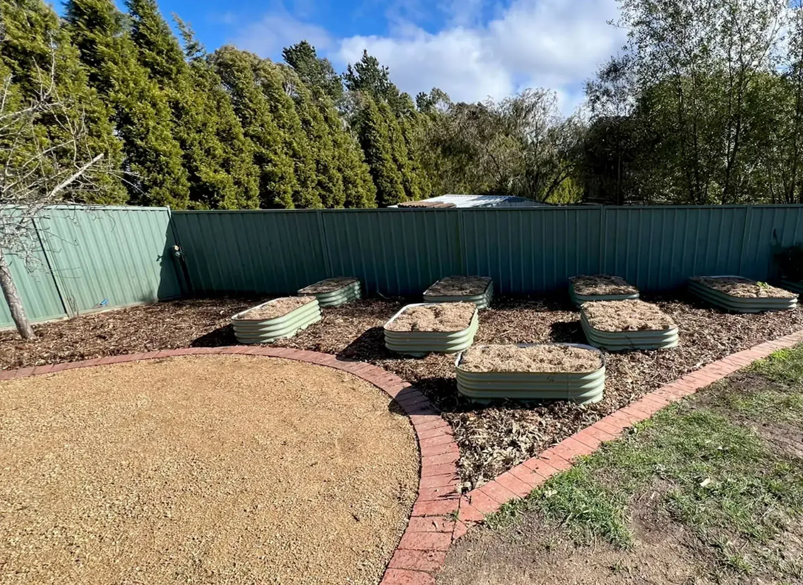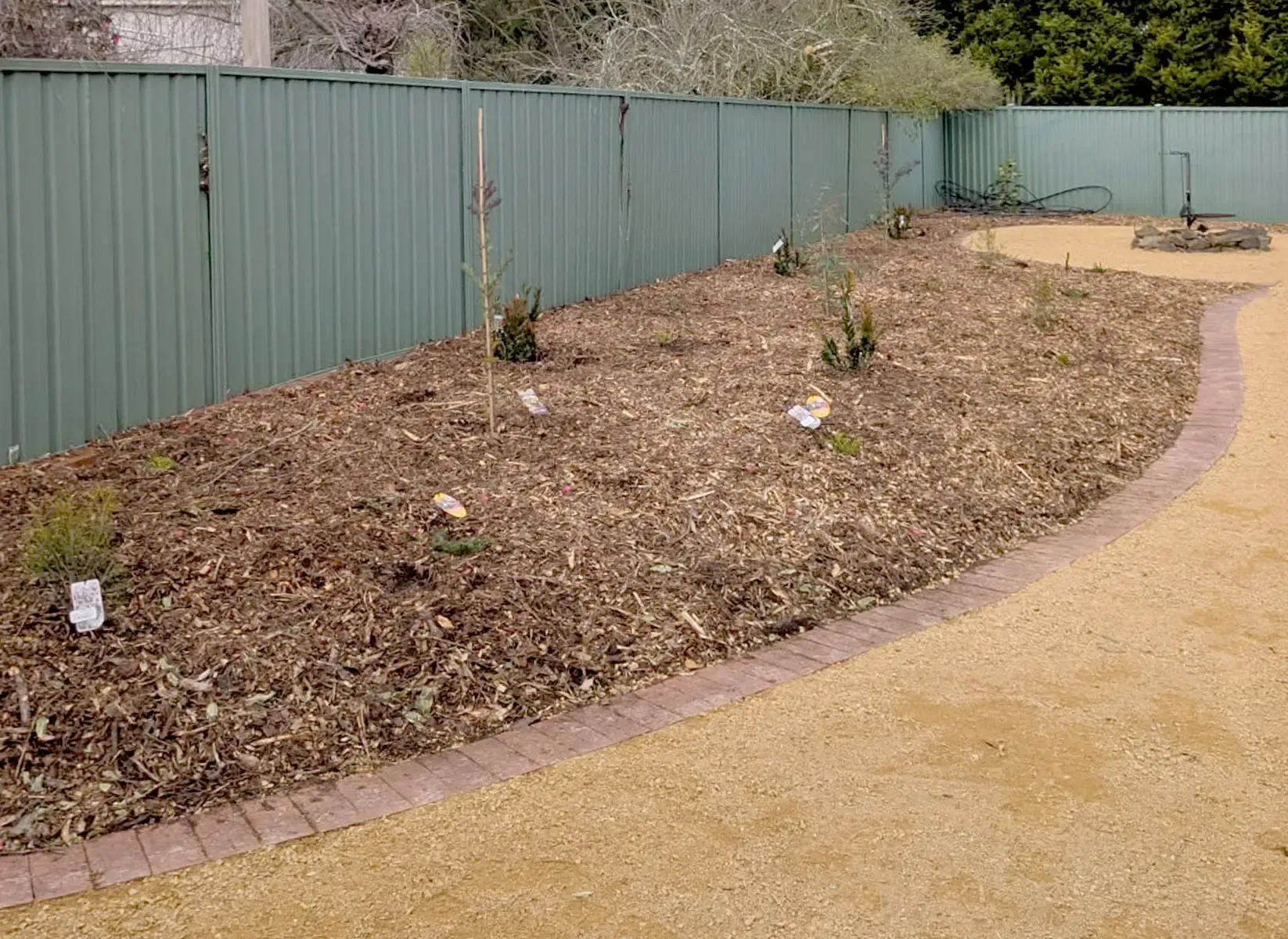 The garden was mulched and planted with a range of natives and trees. We also installed new veggie garden beds, set up an automatic irrigation timer, and repaired damaged brickwork.